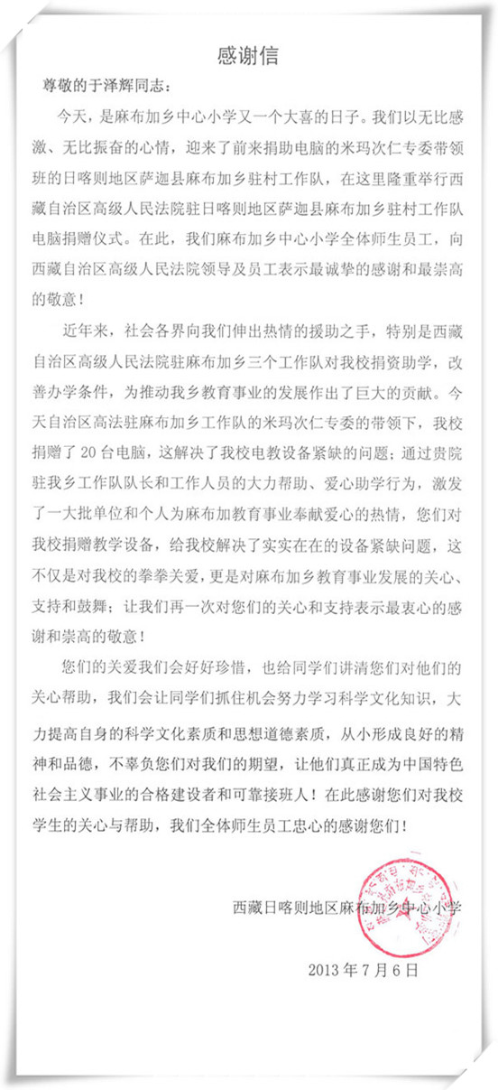 2013年春節前后,集佳先后精心準備了多批電腦,為藏區的孩子們送去了一份份溫暖的春節禮物。近日,集佳陸續收到薩迦縣麻布加鄉小學和日喀則地區薩嘎縣雄如鄉小學的感謝信,感謝集佳捐贈電腦,為學校解決了難題,也為孩子們了解大千世界開啟了一扇門!