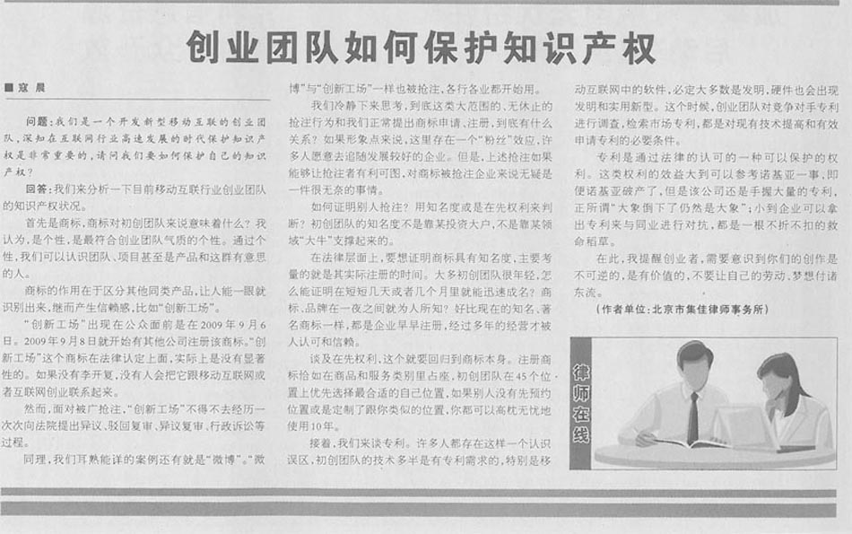 集佳代理人撰文《創業團隊如何保護知識產權》在《中國貿易報》發表