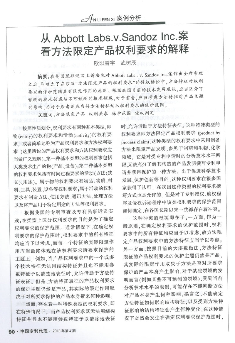集佳代理人文章《從Abbott Lans.v.SandoZ Inc.案看方法限定產品權利要求的解釋》在《中國專利代理》發表