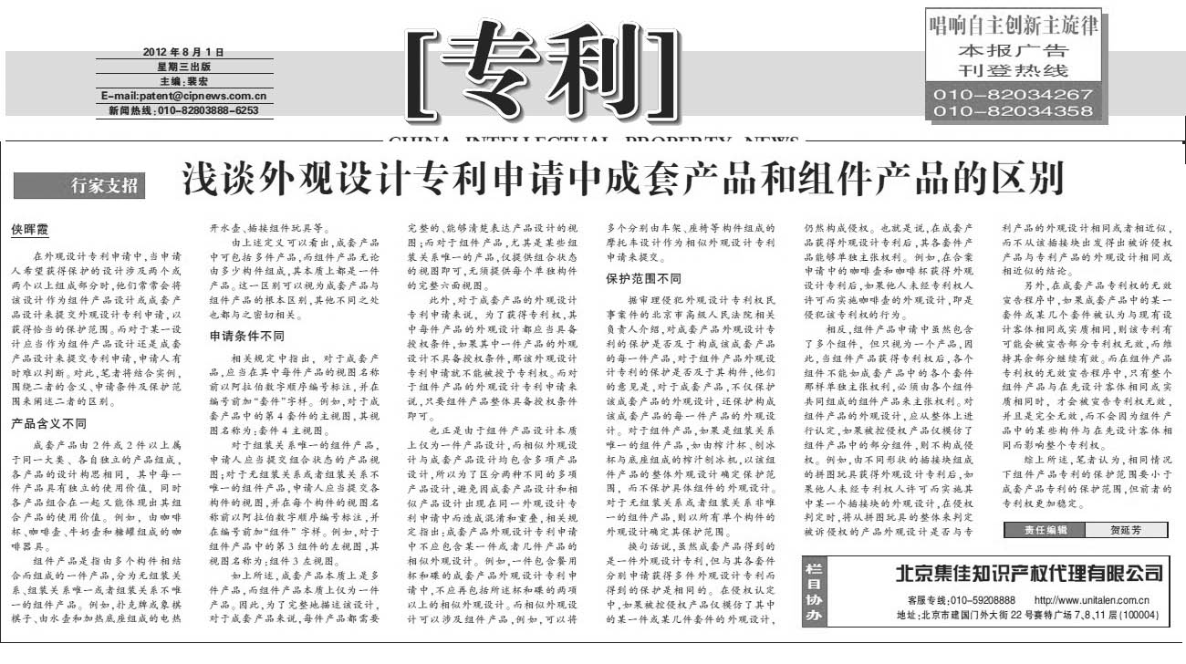 《中國知識產權報》:淺談外觀設計專利申請中成套產品和組件產品的區別