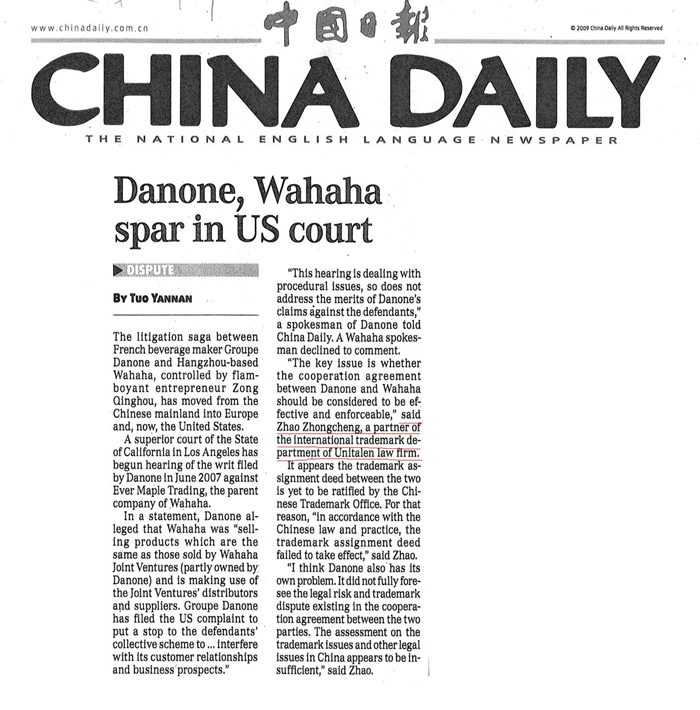 《CHINA DAILY》:Danone,Wahaha spar in US court