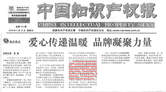 《中國知識產權報》:愛心傳遞溫暖 品牌凝聚力量