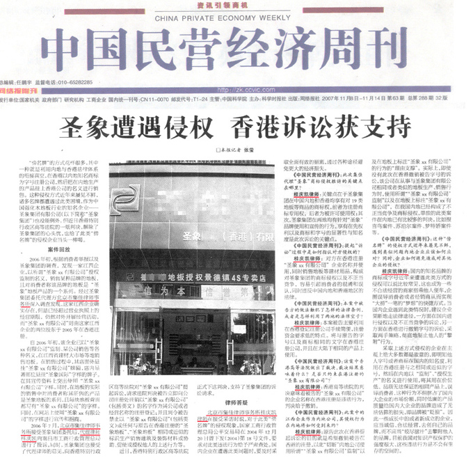 《中國民營經濟周刊》:圣象遭遇侵權 香港訴訟獲支持