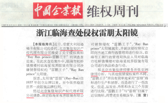 《中國企業(yè)報》:浙江臨海查處侵權雷朋太陽鏡