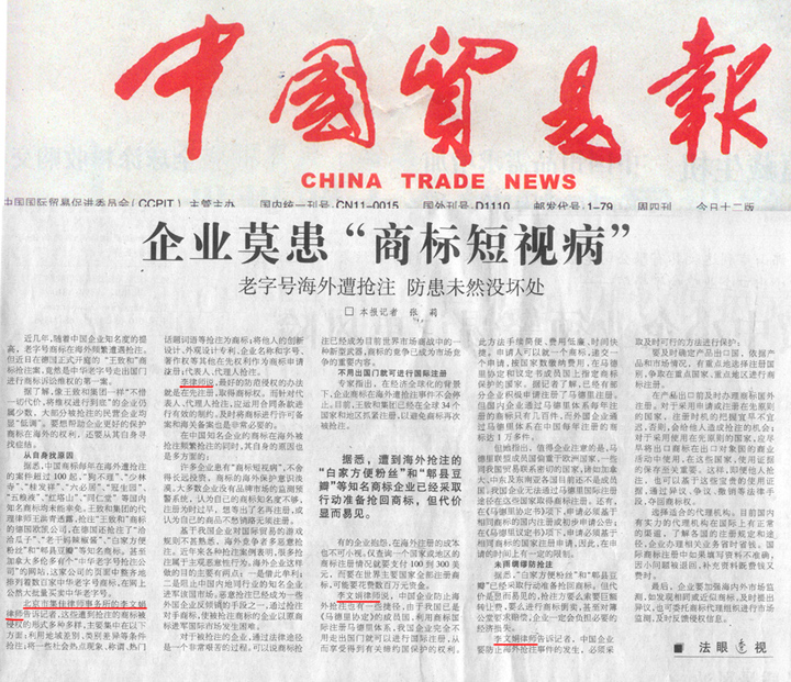 《中國貿(mào)易報》采訪:《企業(yè)莫患“商標(biāo)短視病” 老字號海外遭搶注 防患未然沒壞處》