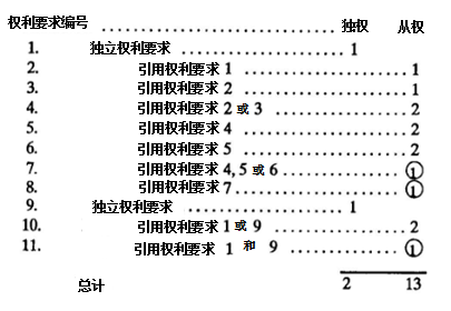 在上面例子中,權(quán)利要求1和9是獨(dú)立權(quán)利要求,權(quán)利要求2-3和5-6各自是從屬權(quán)利要求,權(quán)利要求4引用權(quán)利要求2或3,在費(fèi)用上計(jì)算為兩項(xiàng)權(quán)利要求;權(quán)利要求5-6均直接或間接引用權(quán)利要求4,在費(fèi)用上也各自計(jì)算為兩項(xiàng)權(quán)利要求;權(quán)利要求7和8涉及“多項(xiàng)引用多項(xiàng)”,屬于不符合要求的多項(xiàng)引用權(quán)利要求(即前述所謂的“不適合的多項(xiàng)引用權(quán)利要求”),因此會(huì)被標(biāo)記為“①”;權(quán)利要求10引用了獨(dú)立權(quán)利要求1或9,因此在費(fèi)用上按兩項(xiàng)權(quán)利要求計(jì)算;權(quán)利要求11被標(biāo)記為“①”是因?yàn)槠浞菗褚灰玫姆绞剑ㄒ谩皺?quán)利要求1和9”,而不是“1或9”)。