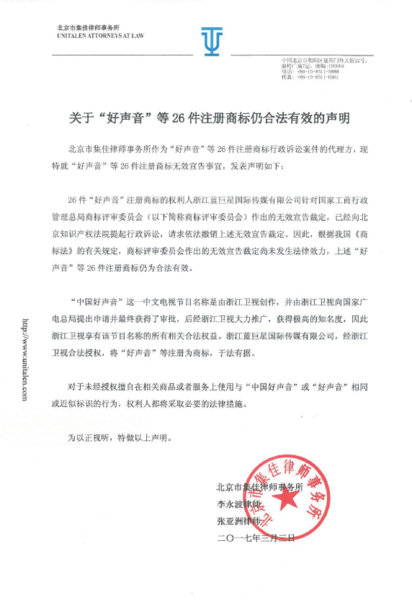 關于“好聲音”等26件注冊商標仍合法有效的聲明
