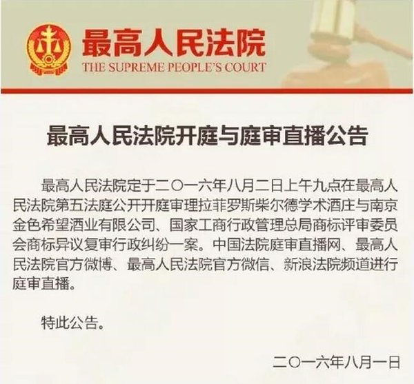 2016年8月1日最高法院通過其官方微博發(fā)布公告,公布了2016年8月2日將對“拉菲莊園”案開庭與庭審直播的消息。8月2日當日,庭審通過中國法院庭審直播網、最高法院官方微博、最高法院官方微信、新浪法院頻道進行了全程直播,庭審持續(xù)了5個多小時。