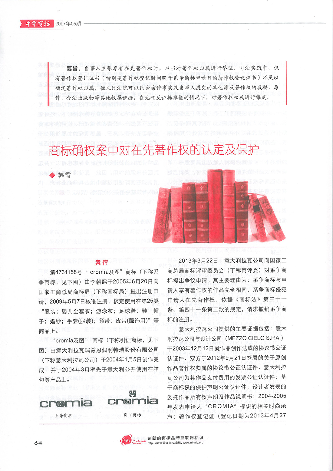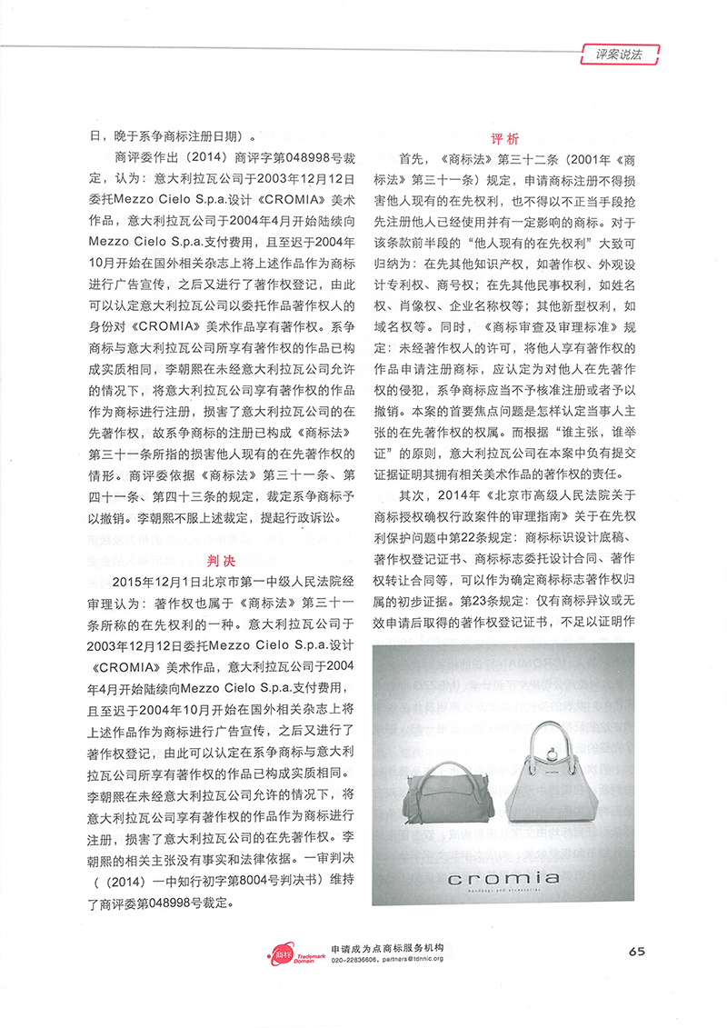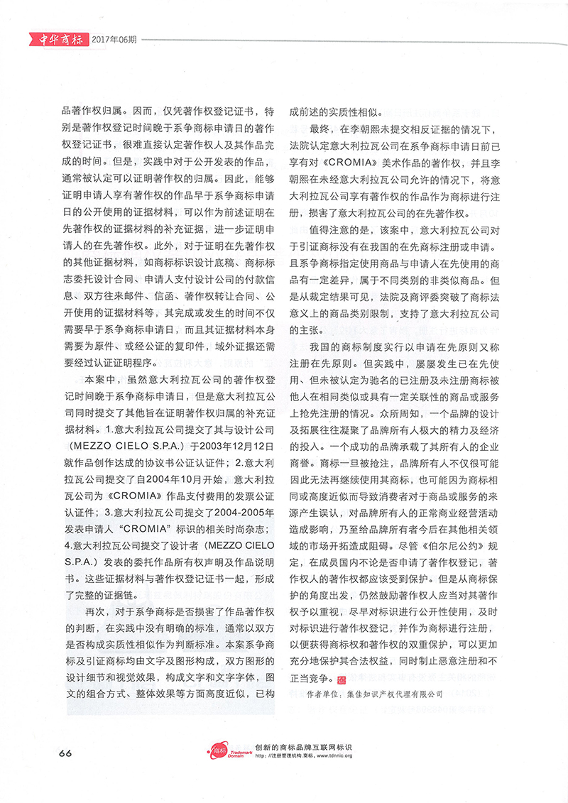 集佳文章《商標確權案中對在先著作權的認定及保護》在《中華商標》發表