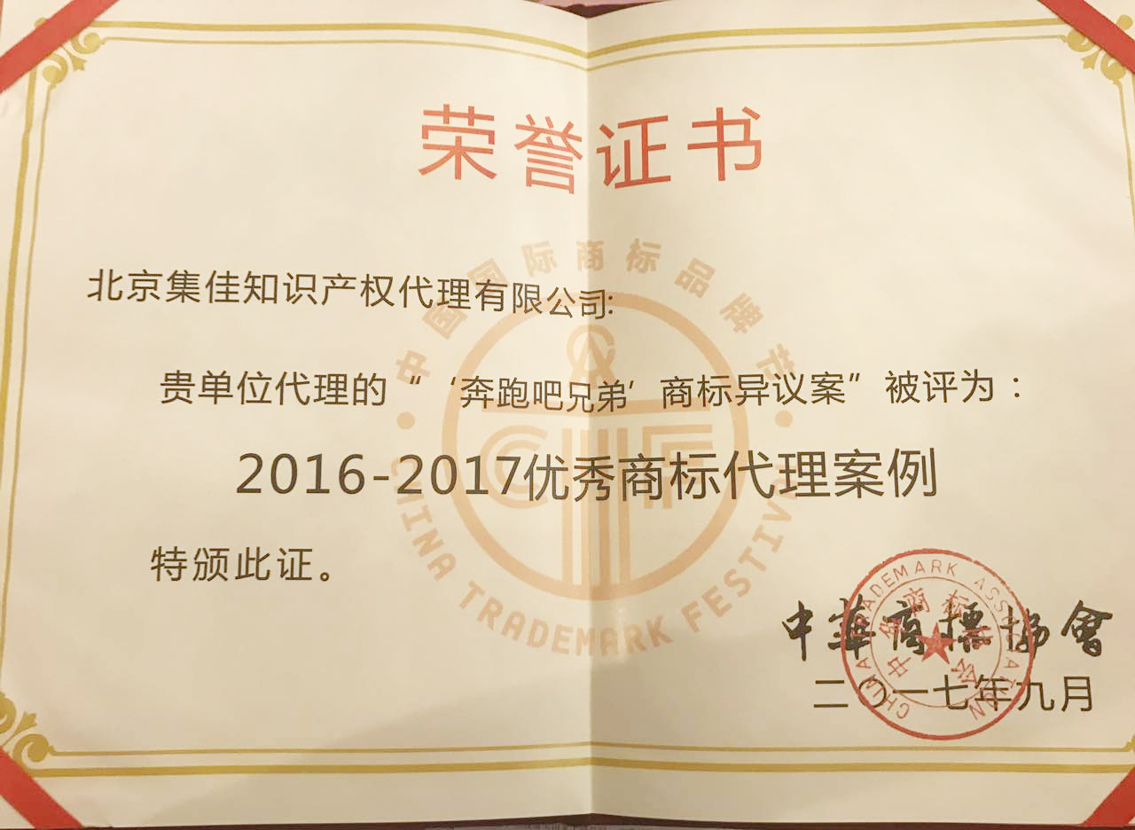 捷報再傳 集佳代理的“奔跑吧兄弟”商標異議案榮獲“2016-2017優秀商標代理案例”