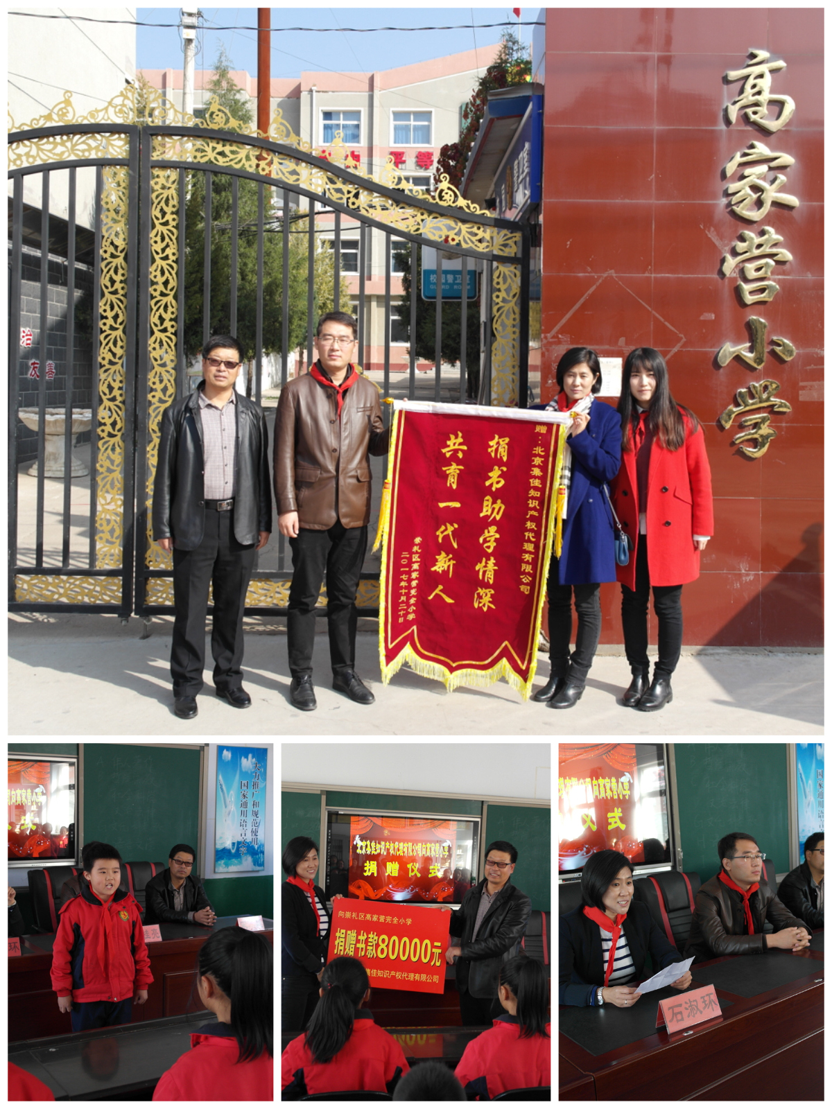 在大家熱情的掌聲下,優秀的少先隊員們為關心他們的領導、來賓系上了鮮艷的紅領巾。學生代表和宋延校長分別發言,對集佳心系教育、慷慨捐贈的義舉表達了誠摯的感謝。集佳代表石淑環主任隨后發言,介紹了集佳公益活動的情況以及本次捐贈活動的初衷,并希望集佳此舉能夠為豐富孩子們的校園生活和拓寬孩子們的視野提供幫助。在這些發自內心的仍帶著稚嫩童聲的歡呼聲中,看似簡單卻意義深遠的捐贈儀式開始,高家營小學領導向集佳贈送了題為“捐書助學情深,共育一代新人”的錦旗。