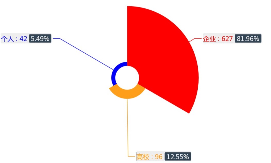 本屆專利獎(jiǎng)獲獎(jiǎng)專利中,企業(yè)專利627件,占比81.90%,高校專利96件,占比12.55%,個(gè)人專利42件,占比僅5.49%