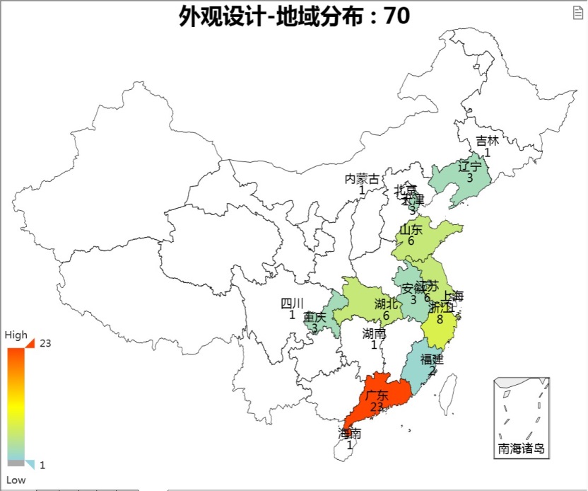 四、獲獎(jiǎng)外觀設(shè)計(jì)集中在東部沿海地區(qū) 70件獲獎(jiǎng)的外觀設(shè)計(jì)中,超過90%的獲獎(jiǎng)外觀設(shè)計(jì)分布在廣東、浙江、福建、江蘇、上海、山東、北京、天津等東部沿海發(fā)達(dá)地區(qū)。這些地區(qū)的加工制造業(yè)發(fā)達(dá),工業(yè)設(shè)計(jì)實(shí)力強(qiáng)勁。