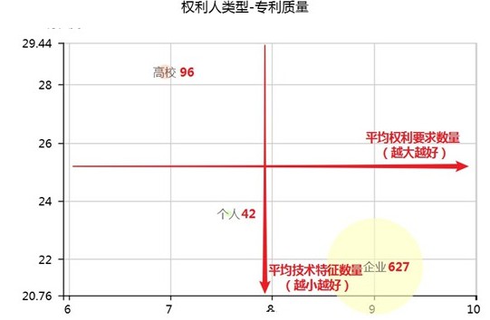下圖為企業(yè)、高校、個(gè)人三種不同類型的權(quán)利人的專利質(zhì)量氣泡。橫坐標(biāo)為平均權(quán)利要求數(shù)量,縱坐標(biāo)為平均技術(shù)特征數(shù)量,氣泡大小為獲獎(jiǎng)專利數(shù)量。