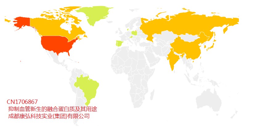 在獲獎(jiǎng)專利中,同族數(shù)量排名第一的是成都康弘科技實(shí)業(yè)(集團(tuán))有限公司的【CN1706867-抑制血管新生的融合蛋白質(zhì)及其用途】,該專利不僅經(jīng)歷過無效考研,還擁有多達(dá)25個(gè)專利族,在14個(gè)國家獲得了授權(quán)。