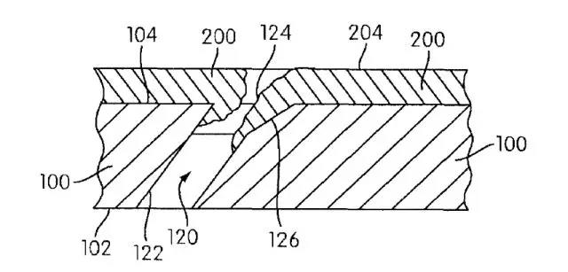 對比文件1教導的是一種再次敞開計量孔的方法,其用于舊構件的翻新或再處理。也就是說,冷卻孔120的翼狀槽126(擴寬部)在施加熱障涂層200之前就已經存在于原有制品100中。這類似于本申請圖2中所示的現有技術。