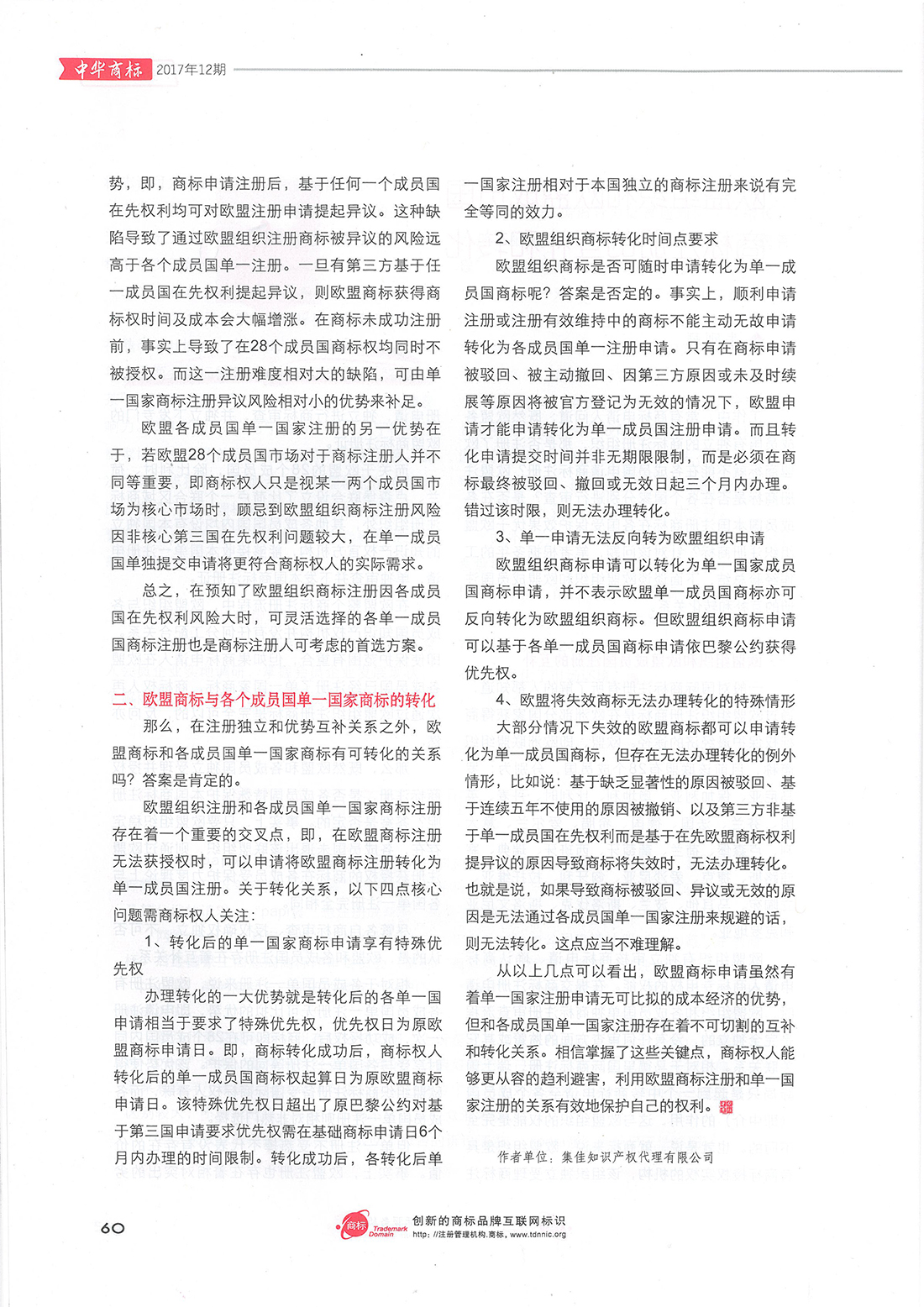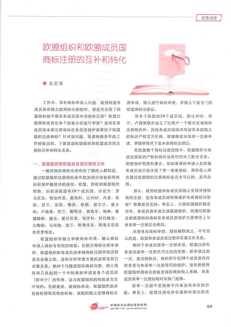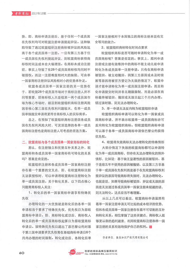 集佳文章《歐盟組織和歐盟成員國商標注冊的互補和轉化》在《中華商標》發表