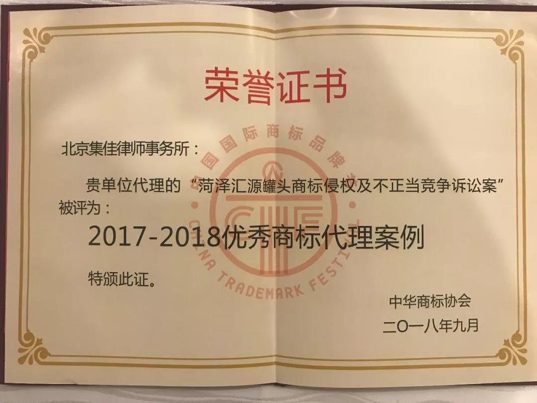 2018中國國際商標品牌節進行到第二日,又一令人期待的獎項頒布了。中華商標協會梳理和回顧了過去一年商標領域發生的重大典型事件、案件,從參加申報的眾多商標代理案例中評選出了26件年度商標典型案例,以此樹立優秀案例標桿,發揮示范指導效應。集佳律師事務所代理的“菏澤匯源罐頭商標侵權及不正當競爭訴訟案”成功入選“2017-2018優秀商標代理案例”。