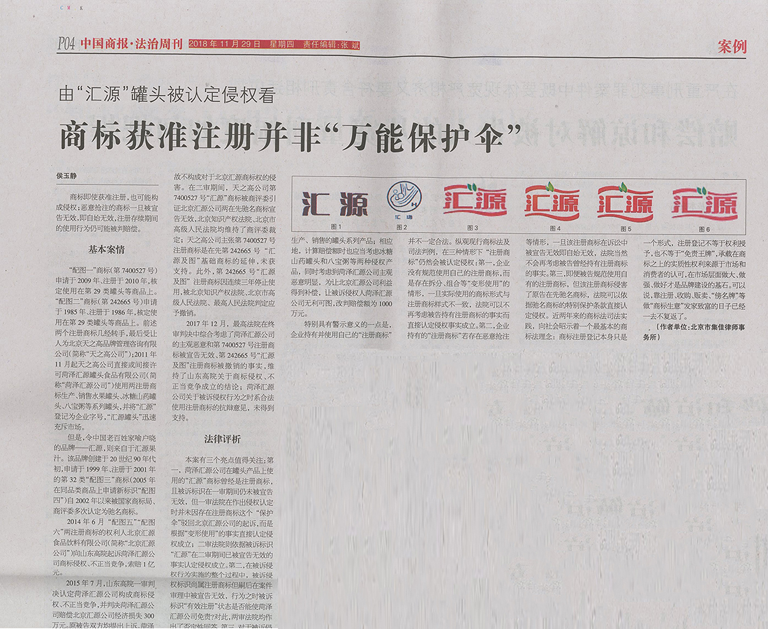集佳文章《由“匯源”罐頭被認(rèn)定侵權(quán)看商標(biāo)獲準(zhǔn)注冊并非“萬能保護傘”》在《中國商報》發(fā)表