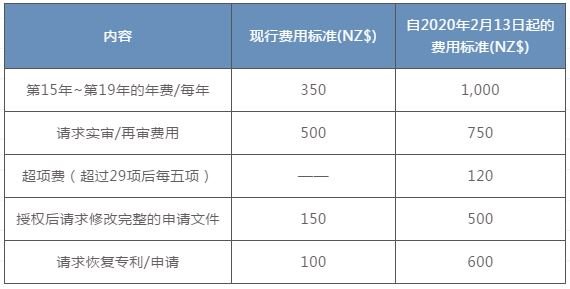 自2020年2月13日起,新西蘭將執行新的官費標準,較為重要的費用調整包括:(1)引入超項費;(2)審查費用增加;(3)大大調高了維持費和續展費,尤其從第15年開始,詳見下表: