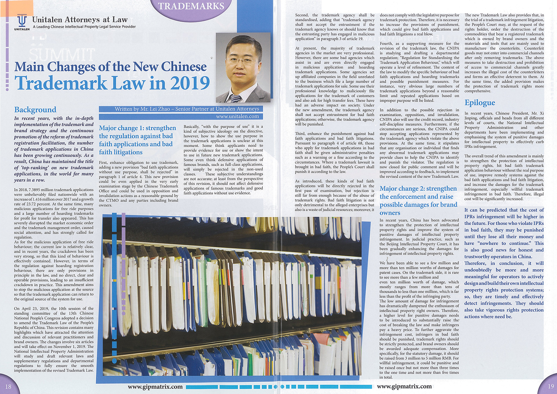 集佳合伙人趙雷律師文章《Main Changes of the New Chinese Trademark Law in 2019》在《Global IP Matrix》發表