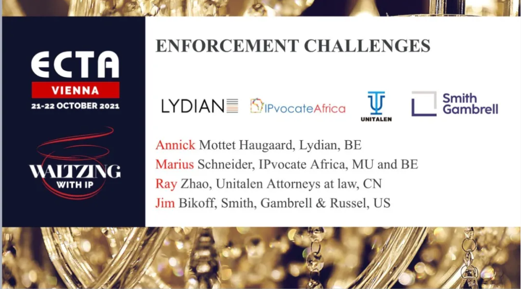 歐洲商標協會(ECTA)第39屆年會“與IP共舞”將于2021年10月21-22日在維也納舉行。為了重現ECTA年會的啟動慣例,10月13日,ECTA在線舉行了年會例行的“周三研討會”——“商標保護挑戰研討會”與“WIPO-EUIPO研討會”,這也是年會“重要會議包”內容之一。集佳合伙人趙雷律師應邀參加商標權保護挑戰的主題討論,與來自比利時的前ECTA主席、Lydian事務所的高級合伙人Annick,美國Smith, Gambrell & Russel事務所的高級合伙人Jim,以及毛里求斯IPvocate事務所的Marius等行業專家共同探討商標權人在全球各地商標權保護的挑戰與對策。