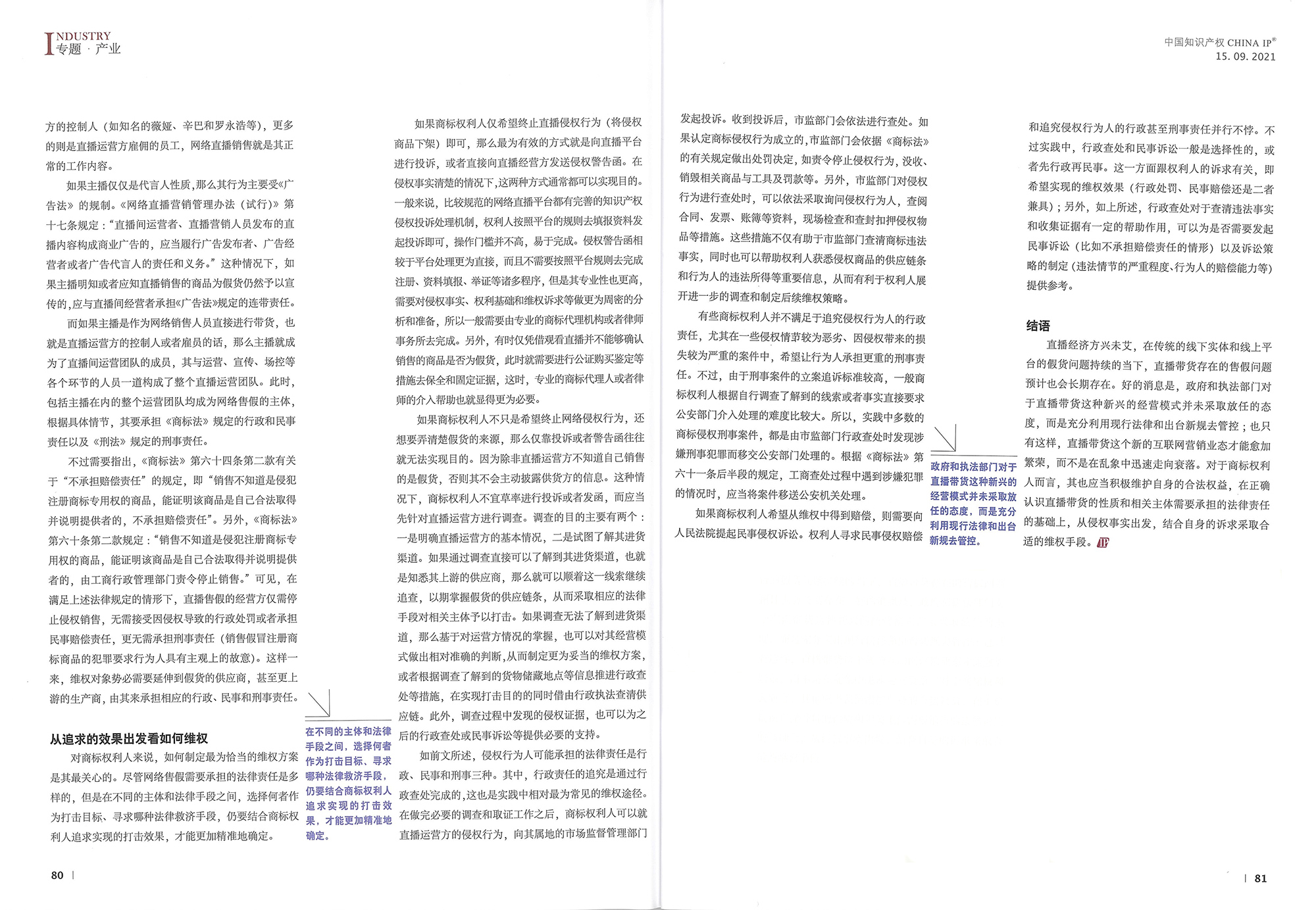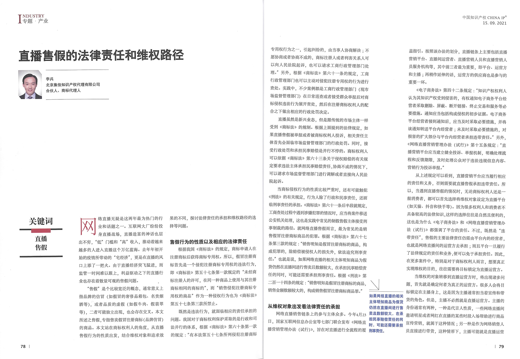 集佳文章《直播售假的法律責(zé)任和維權(quán)途徑》在《中國知識產(chǎn)權(quán)》發(fā)表