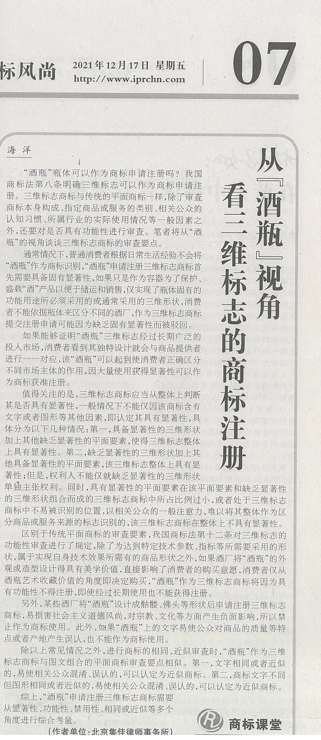 集佳文章《從「酒瓶」視角看三維標(biāo)志的商標(biāo)注冊(cè)》在《中國(guó)知識(shí)產(chǎn)權(quán)報(bào)》發(fā)表