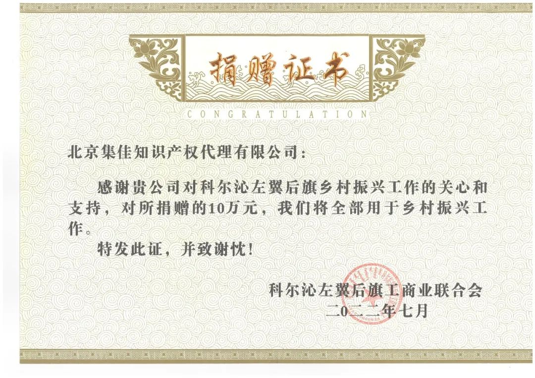 近日,集佳知識產權積極響應朝陽區工商聯的鄉村振興幫扶倡議,捐資10萬元支持內蒙古自治區科爾沁左翼后旗鄉村振興建設,并收到科爾沁左翼后旗工商業聯合會的致謝。