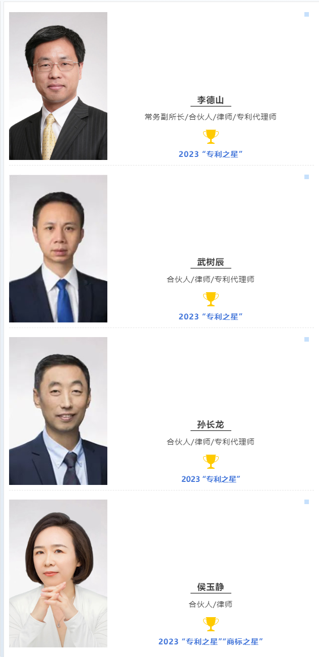 同時,李德山副所長、武樹辰律師、孫長龍律師和侯玉靜律師因其在各自領域的卓越實力和杰出表現(xiàn),分別獲評2023 IP Stars“專利之星”“商標之星”美譽。