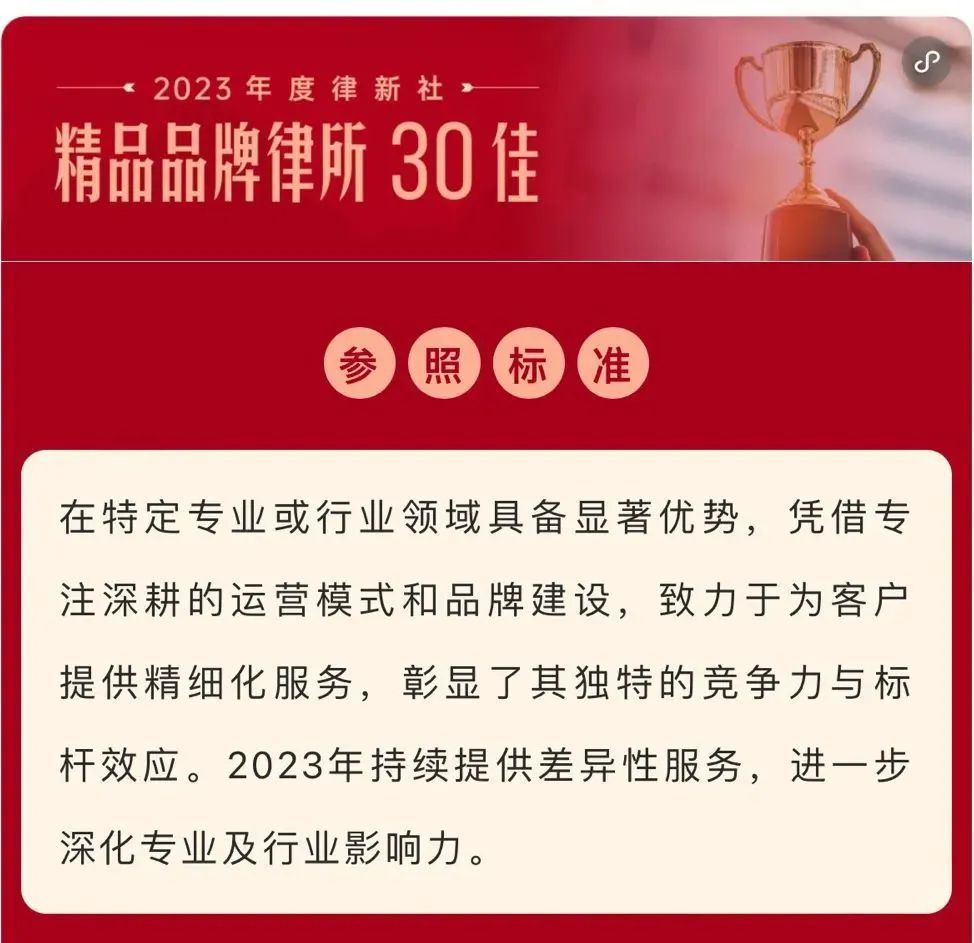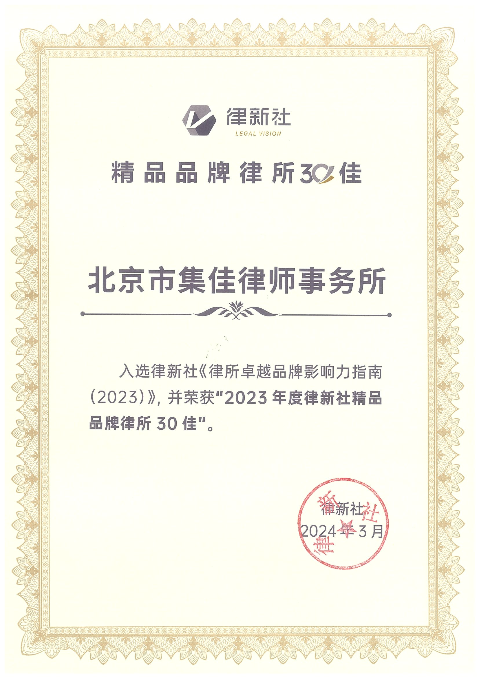2024年3月2日,由中國法學交流基金會指導、律新社主辦的“致·追光者”第二屆法律服務業品牌發展論壇暨律新社2023年度品牌盛典隆重舉行,現場發布了備受關注的《律所卓越品牌影響力指南(2023)》,北京市集佳律師事務所憑借在知識產權領域的卓越實力和良好口碑,榮登“2023年度律新社精品品牌律所30佳”榜單。