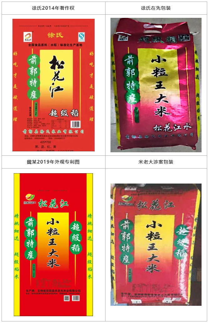28號(hào)案結(jié)案后,主辦律師建議客戶(hù)進(jìn)行反擊。一方面,徐氏米業(yè)公司和米老大米業(yè)公司注冊(cè)地址毗鄰,魏某通過(guò)前郭縣米老大米業(yè)公司在云南蒙自地區(qū)銷(xiāo)售小粒王大米,其經(jīng)銷(xiāo)商曾經(jīng)代理銷(xiāo)售徐氏米業(yè)小粒王大米,魏某具備“主觀惡意”;另一方面,徐氏米業(yè)公司早在2014年即完成了被訴稻米包裝袋的設(shè)計(jì),是原始著作權(quán)人,米老大公司使用的相似包裝袋與徐氏公司的產(chǎn)生了混淆。因此,可以針對(duì)魏某濫訴和米老大米業(yè)公司的著作權(quán)侵權(quán)和不正當(dāng)競(jìng)爭(zhēng)行為進(jìn)行反訴維權(quán)。