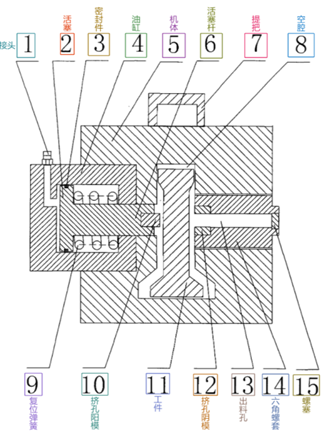 一種液壓開孔器,包括油泵、油管、開有可容納鋼軌的空腔的機(jī)體、安裝于機(jī)體內(nèi)的油缸、設(shè)于油缸內(nèi)的活塞和活塞桿、位于空腔一側(cè)的擠孔陽(yáng)模、位于空腔另一側(cè)的擠孔陰模、出料孔,所述擠孔陽(yáng)模安裝于活塞桿前端,活塞桿、擠孔陽(yáng)模、擠孔陰模三者的中心線在同一條直線上,其特征在于:所述機(jī)體為下端封閉的環(huán)狀結(jié)構(gòu),開有可容納鋼軌的空腔位于機(jī)體中部。