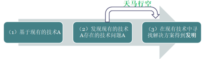 發(fā)明創(chuàng)造的實(shí)際產(chǎn)生過(guò)程通常可以模型化為:基于現(xiàn)有的技術(shù)A,發(fā)現(xiàn)技術(shù)A中存在的技術(shù)問(wèn)題A’,技術(shù)人員隨機(jī)在現(xiàn)有技術(shù)中尋找可以解決該技術(shù)問(wèn)題的現(xiàn)有技術(shù)手段,經(jīng)過(guò)實(shí)驗(yàn)和驗(yàn)證,最終得到可以解決該技術(shù)問(wèn)題A’的技術(shù)方案,即發(fā)明創(chuàng)造本身。這個(gè)過(guò)程中,技術(shù)人員的思維是“天馬行空”式不受限制的。