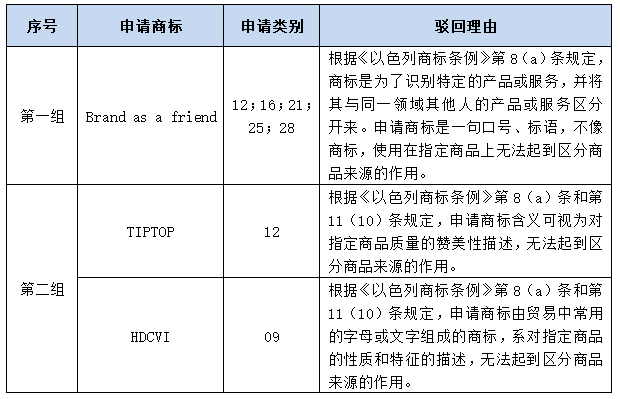 以色列官方下發(fā)缺顯駁回的法律依據(jù):《以色列商標(biāo)條例》第8(a)條和第11(10)條。具體而言,第8(a)條規(guī)定“任何商標(biāo),除非其能將商標(biāo)所有人的商品/服務(wù)與其他人的商品/服務(wù)區(qū)分開來,否則其不具備注冊為商標(biāo)的資格。”以及第11(10)條規(guī)定“由貿(mào)易中常用的數(shù)字、字母或文字組成的商標(biāo),用于區(qū)分或描述商品或商品類別,或直接指代其特性和質(zhì)量,除非該商標(biāo)已通過大量使用獲得顯著性特征”。