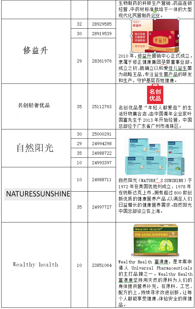 在分析系爭商標申請人申請注冊商標之時,需要對其申請的商標進行逐一分析、比對,并闡述說明被搶注的商標的真實權利人的情況,并提供參考證據。如第23851064號“WEALTHY HEALTH”商標無效宣告案(系爭商標申請人共申請156件商標)中,代理人發現該商標申請人北京鑫鵬福元商貿有限公司申請的多件商標與其他具有強顯著性和知名度的商標相同或者近似,且被搶注的商標的真實權利人根據查詢均可以一一對應。通過列表,這些系爭商標申請人搶注他人的情況可以很清晰的展示出來。