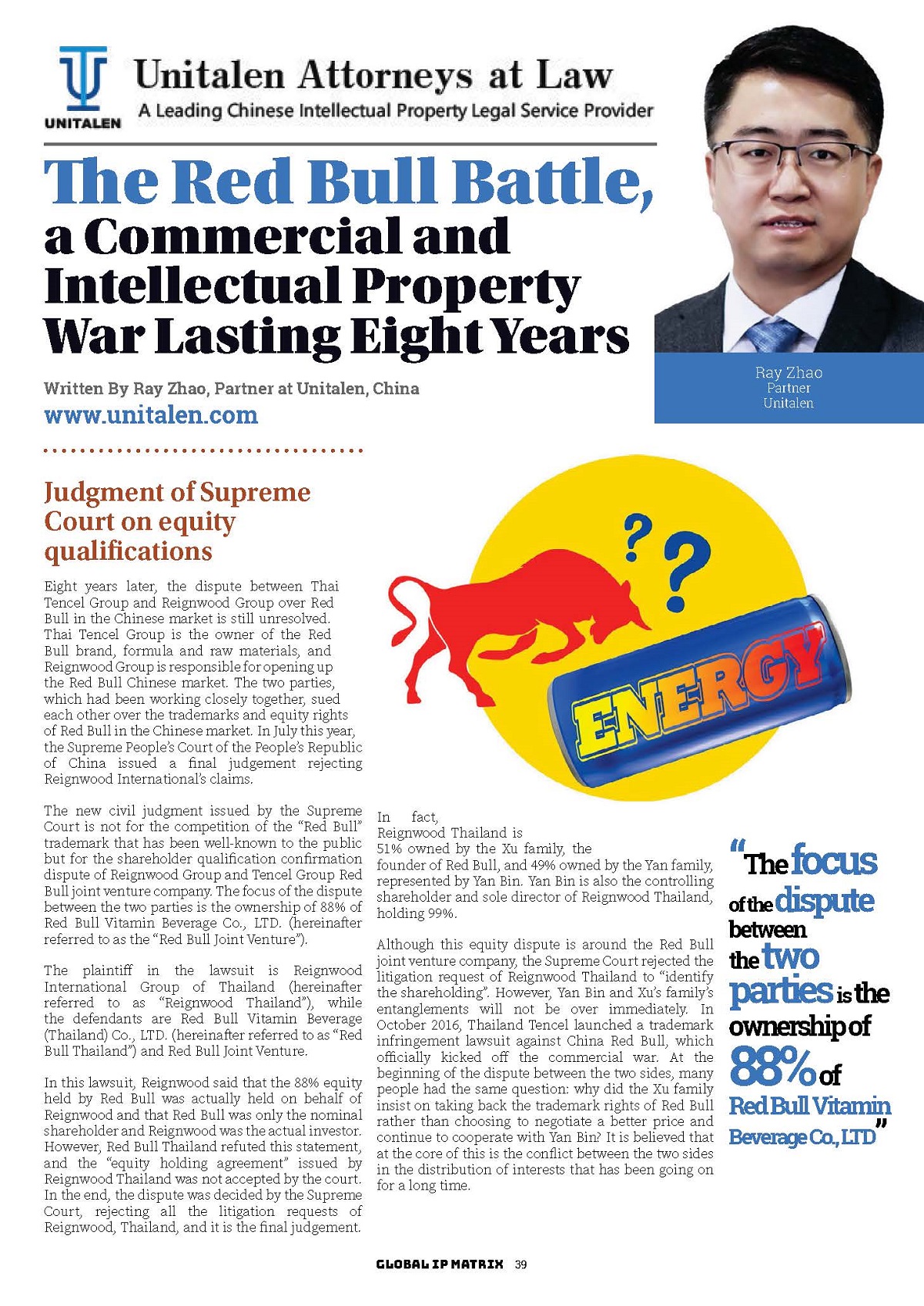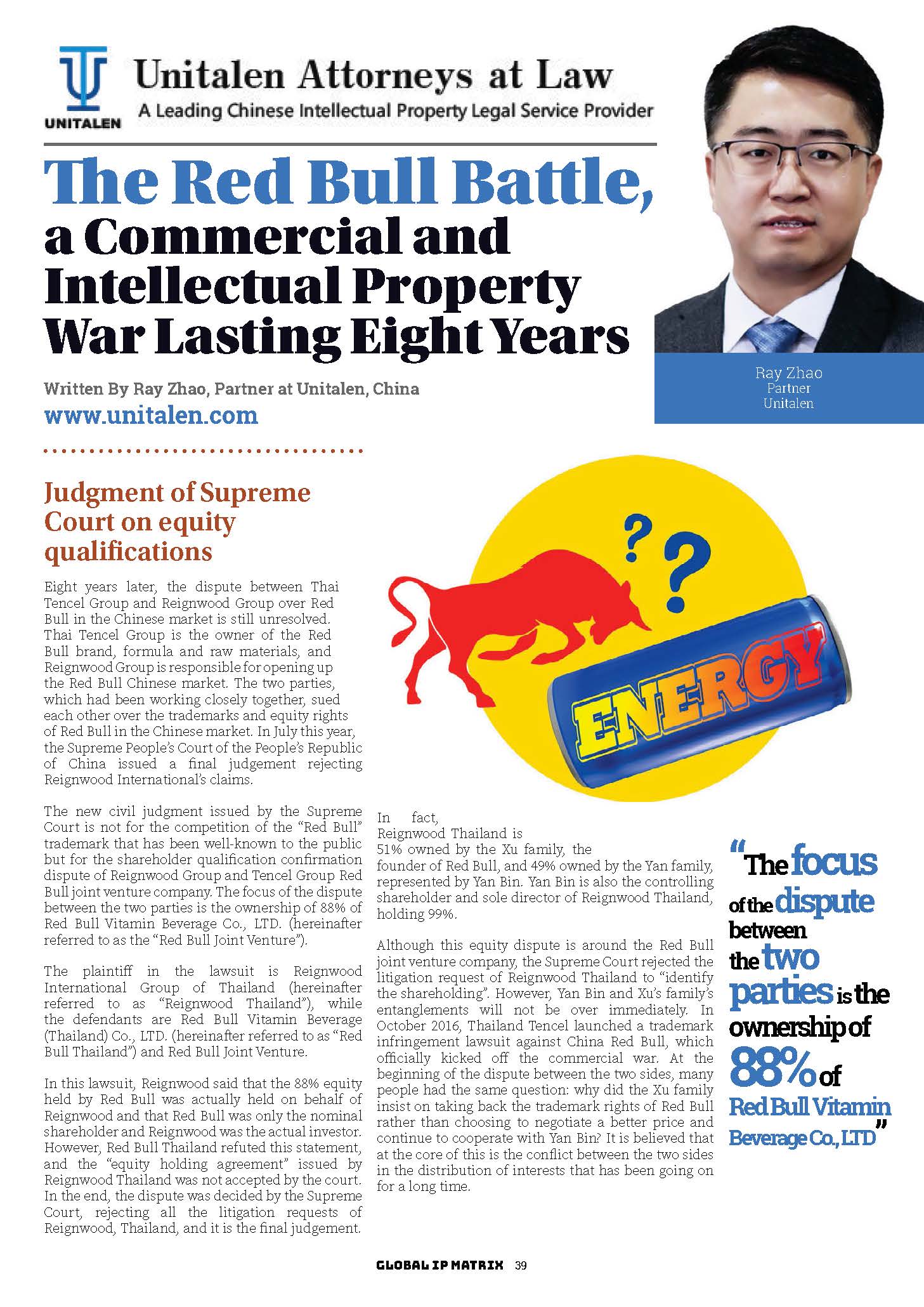 集佳文章《The Red Bull Battle, a Commercial and Intellectual Property War Lasting Eight Years》在《Global IP Matrix》上發表